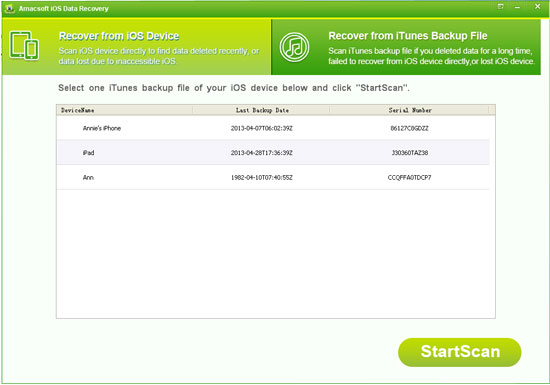 Select "Recover from iTunes Backup File" mode after launching the program on your computer. Then all backup files on your computer will be scanned and shown in the main interface. Select the one of your iPhone and click "StartScan" button to scan your device.